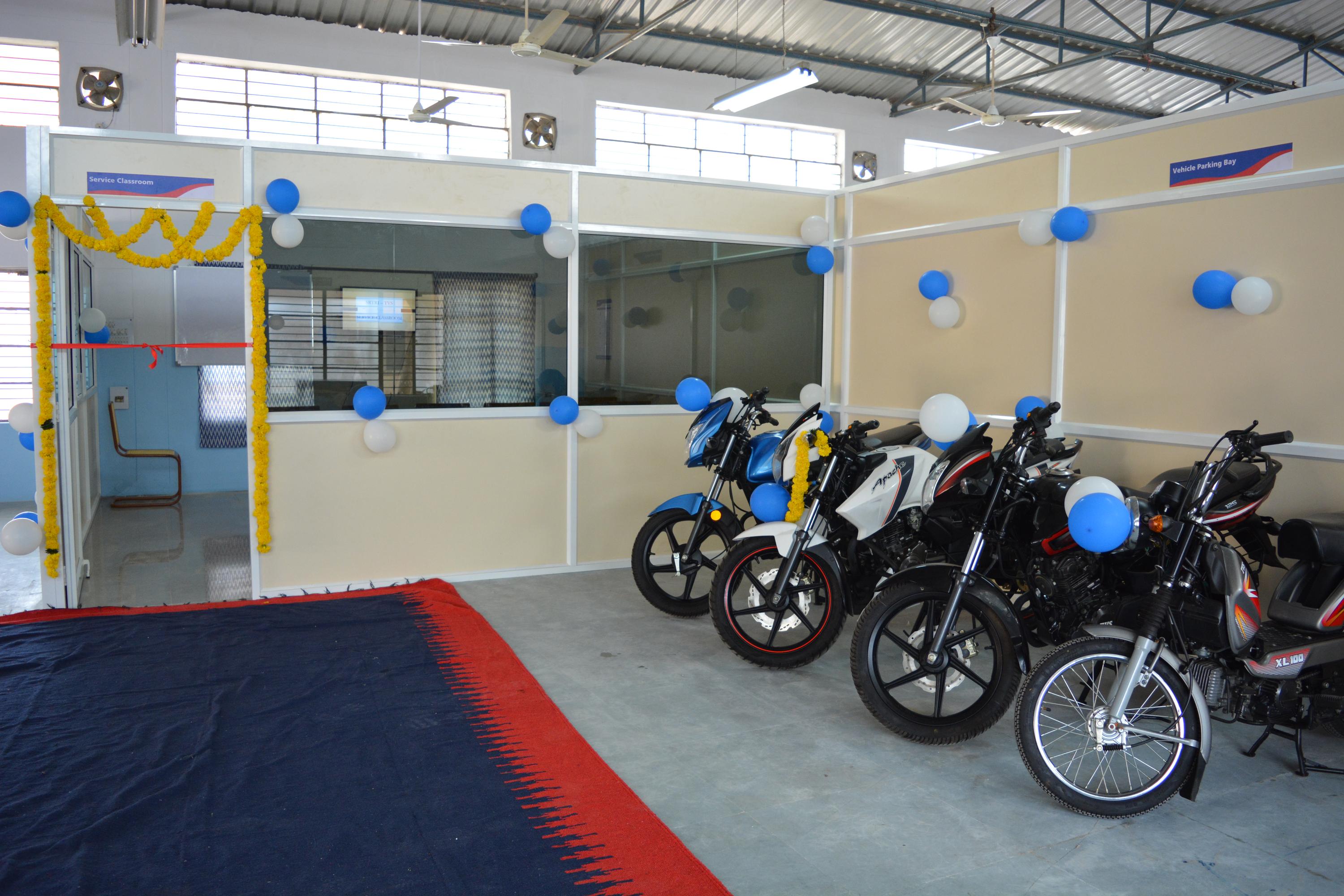 TVS Motor Company, T.N. established its product training center termed as “SRTRI-TVS Community” College in SRTRI campus on 1st December 2016 and has been extending their technical, machinery, training and placement support. They provided their two-wheelers of popular brands, special tools, and other equipment to training center. Further, they also provided their propriety training content in the form of print, video forms. The in-house automotive faculty of the Institute underwent TOT by the TVS at their factory. The master trainers and SMEs from TVS also take part in the training program as guest faculty. During the at the course end, the trainees are assessed by the TVS and certified. The successful candidates are placed with the TVS Dealer Network in Telangana with the help of TVS Motor Company Ltd.