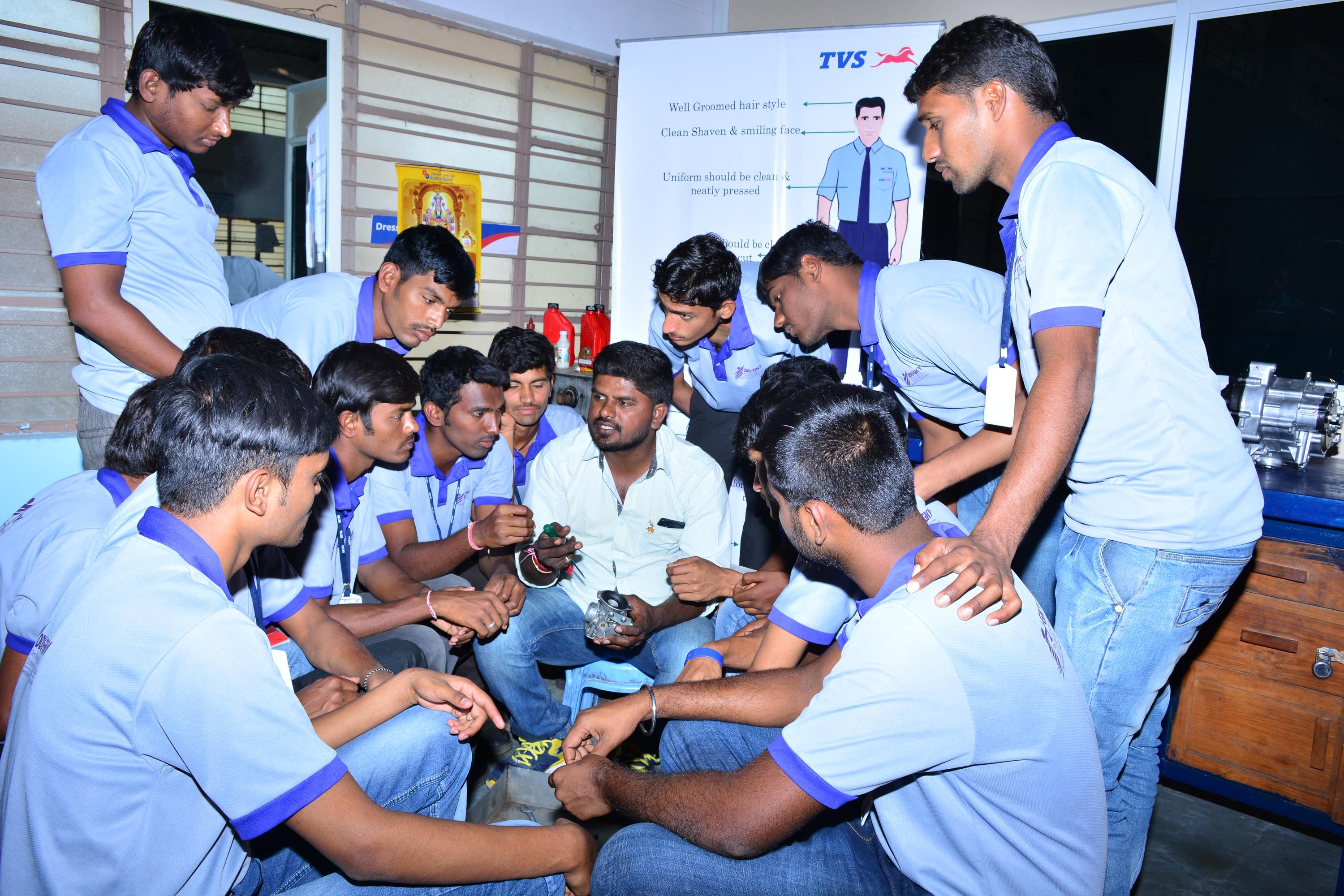 TVS Motor Company, T.N. established its product training center termed as “SRTRI-TVS Community” College in SRTRI campus on 1st December 2016 and has been extending their technical, machinery, training and placement support. They provided their two-wheelers of popular brands, special tools, and other equipment to training center. Further, they also provided their propriety training content in the form of print, video forms. The in-house automotive faculty of the Institute underwent TOT by the TVS at their factory. The master trainers and SMEs from TVS also take part in the training program as guest faculty. During the at the course end, the trainees are assessed by the TVS and certified. The successful candidates are placed with the TVS Dealer Network in Telangana with the help of TVS Motor Company Ltd.